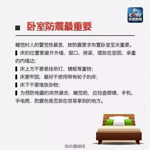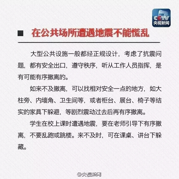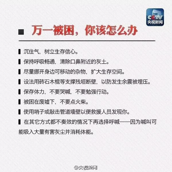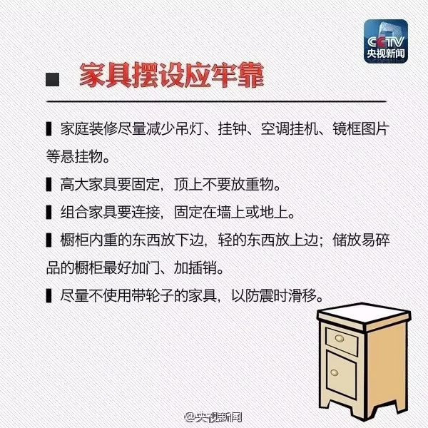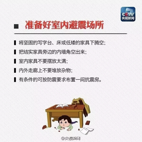 “寧可千日不震,不可一日不防”。災(zāi)難一旦發(fā)生,生死存亡就在瞬息之間。所以,日常生活中應(yīng)當(dāng)學(xué)習(xí)、掌握應(yīng)急避震知識,準(zhǔn)備地震應(yīng)急包,萬一遭遇強(qiáng)震,就能減少自己和家人的生命危險。