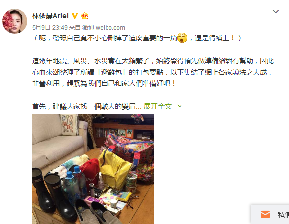 今日臺灣偶像劇女王林依晨在微博上發(fā)布了一條關(guān)于準(zhǔn)備防災(zāi)應(yīng)急包的微博,她在微博中表示現(xiàn)在的地震、風(fēng)災(zāi)、水災(zāi)都實(shí)在是太頻繁了,始終覺得預(yù)先準(zhǔn)備防災(zāi)應(yīng)急包絕對有幫助,并為自己和家人們準(zhǔn)備了這樣的防災(zāi)應(yīng)急包。這條微博目前已經(jīng)被點(diǎn)贊了2萬多次,可見明星的影響。