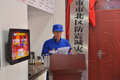 青島市市北區(qū)海麗地震救援志愿者隊伍授旗暨海麗雅防震減災(zāi)宣傳教育基地揭牌儀式,海麗雅集團(tuán)董事長張旭明發(fā)表講話