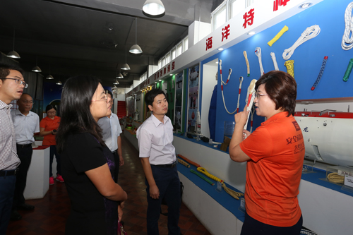 海麗雅集團(tuán)副總經(jīng)理、研發(fā)中心主任黃濤為陳黎明秘書一行匯報(bào)了企業(yè)質(zhì)量管理工作執(zhí)行情況:長期以來,在各級(jí)技術(shù)監(jiān)督部門的關(guān)心指導(dǎo)下,海麗雅集團(tuán)堅(jiān)持質(zhì)量強(qiáng)企,通過導(dǎo)入“卓越績效體系”、“ISO9001”、“CCC認(rèn)證”等管理體系,實(shí)行“首席質(zhì)量官制度”、“質(zhì)量基金制度”、“董事長基金制度”,開展QC小組、五小(小建議、小革新、小攻關(guān)、小發(fā)明、小創(chuàng)造)等全體職工范圍的質(zhì)量管理活動(dòng),打牢質(zhì)量基礎(chǔ),提高質(zhì)量管理水平,實(shí)現(xiàn)了質(zhì)量和經(jīng)濟(jì)效益雙提升。公司相繼為國家載人潛水器“蛟龍?zhí)?rdquo;、國家海洋科考船“大洋一號(hào)”、“科學(xué)號(hào)”配套特種繩纜,打破了國外壟斷局面。2016年8月,我國深?瓶歼M(jìn)入“萬米時(shí)代”,本次科考中,公司為海底探測(cè)地震儀布放配套特種繩纜,并成功獲取完整地震剖面,保護(hù)了國家科研成果。在產(chǎn)品展廳,海麗雅集團(tuán)董事長張旭明為陳黎明秘書一行展示了這些海洋科考的“功臣”繩纜。此外,董事長張旭明為調(diào)研領(lǐng)導(dǎo)介紹了應(yīng)急產(chǎn)品及“體驗(yàn)式”應(yīng)急安全培訓(xùn)的創(chuàng)新發(fā)展成果。