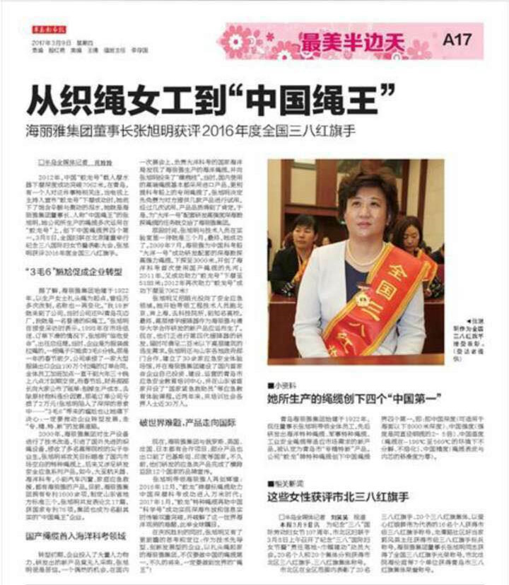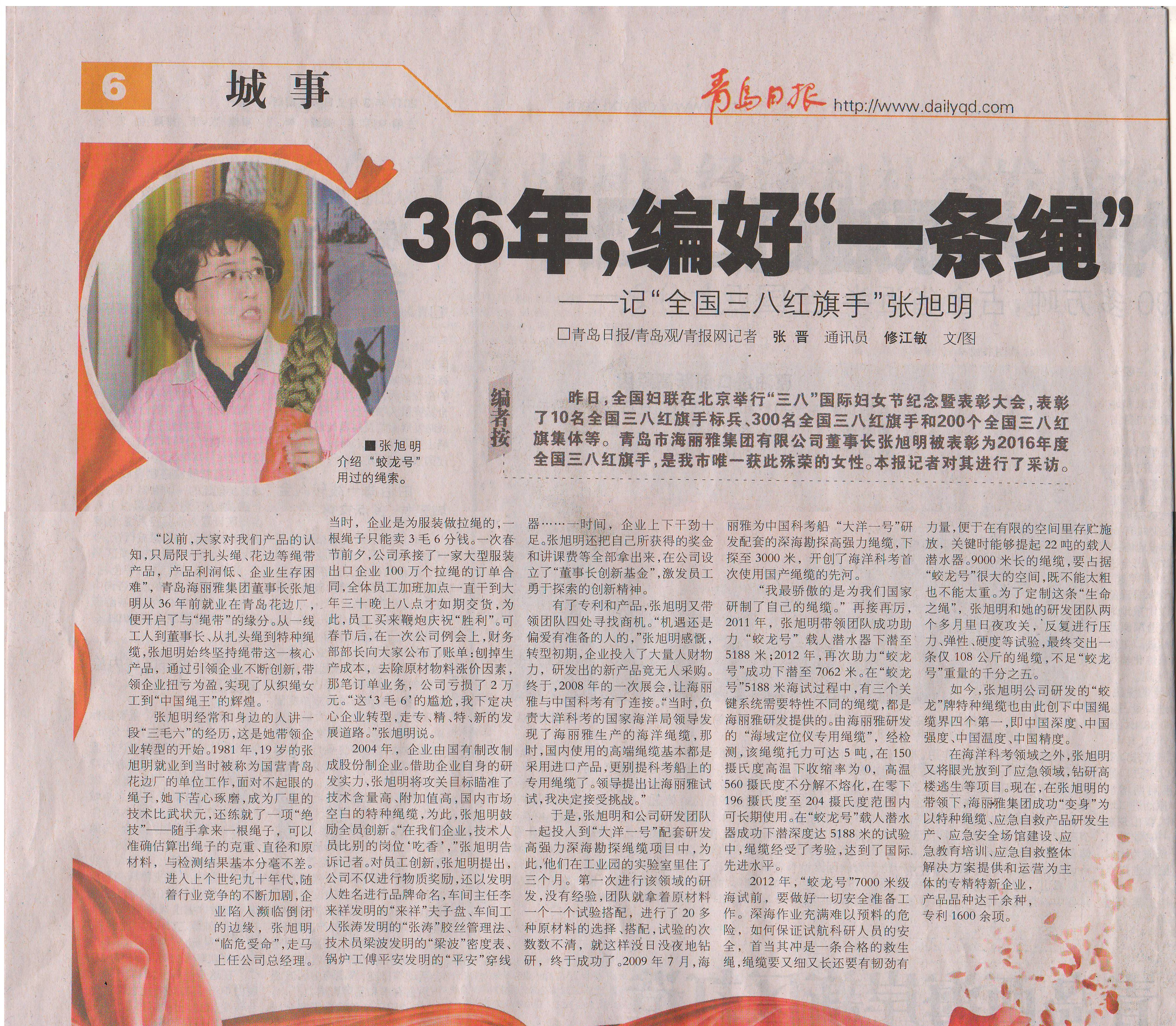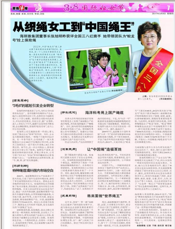 “業(yè)精于勤,荒于嬉;行成于思,毀于隨”,用在張旭明身上最貼切。36年的光陰,張旭明毫不吝嗇的奉獻給海麗雅,從織繩女工到“中國繩王”,這背后砥礪前行的痛楚也只有她自己最清楚。但是,路漫漫其修遠兮,張旭明會一直秉持“大國匠心”的理念,將繩纜產(chǎn)業(yè)做到極致,要讓自己的繩纜走出國門,站在世界的舞臺上,為國爭光!