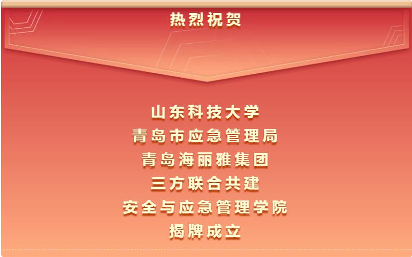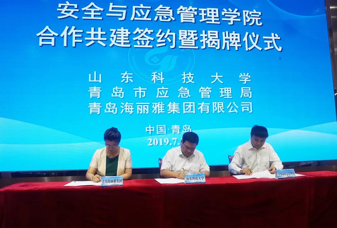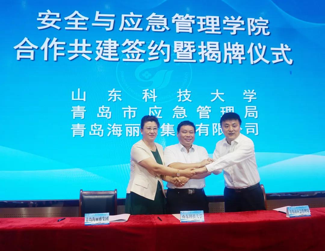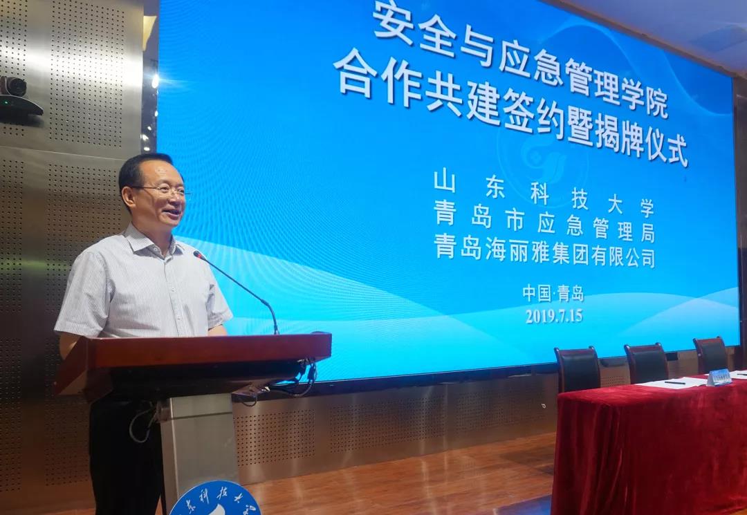2019年7月15日,山東科技大學(xué)、青島市應(yīng)急管理局、青島海麗雅集團(tuán)三方聯(lián)合共建的“安全與應(yīng)急管理學(xué)院”舉行揭牌儀式。中央黨校(國(guó)家行政學(xué)院)應(yīng)急管理培訓(xùn)中心(中歐應(yīng)急管理學(xué)院)主任(院長(zhǎng))/中國(guó)應(yīng)急管理學(xué)會(huì)副會(huì)長(zhǎng)馬寶成、山東科技大學(xué)黨委書記羅公利、 青島市政府副秘書長(zhǎng)萬(wàn)建忠、青島市應(yīng)急管理局局長(zhǎng)張建剛、青島海麗雅集團(tuán)董事長(zhǎng)張旭明出席會(huì)議。