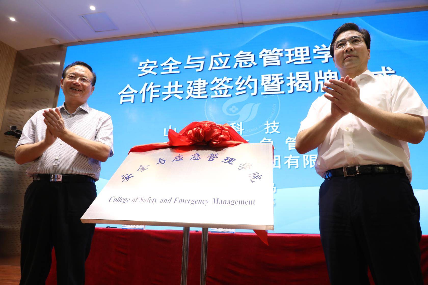 山東科技大學(xué)黨委書記羅公利(左)、青島市政府副秘書長(zhǎng)萬(wàn)建忠(右)為“安全與應(yīng)急管理學(xué)院”揭牌