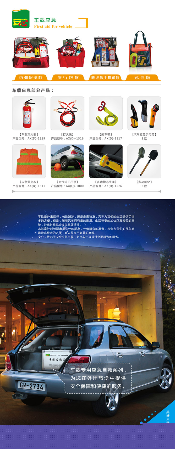 車載應(yīng)急箱中涵蓋了一些汽車旅途中意外解決工具,如手電筒、滅火器、打火線、多功能軍鏟、拖車帶、應(yīng)急熒光衣、防護(hù)手套、折疊水桶、多功能逃生錘、三腳架等。客戶也可以根據(jù)個人具體情況添置應(yīng)急用品。