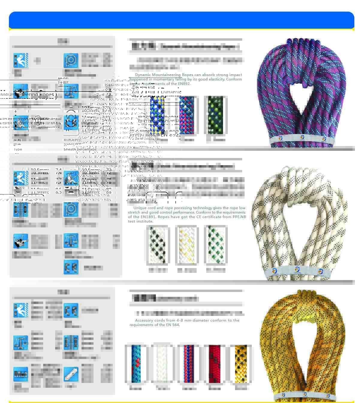 特殊繩芯處理以及繩體后處理技術,賦予繩索低延展性,更好的控制力。性能指標符合歐盟標準EN 1891。已經(jīng)獲得具有PPE指令的NB機構測試發(fā)證的國際CE證書。