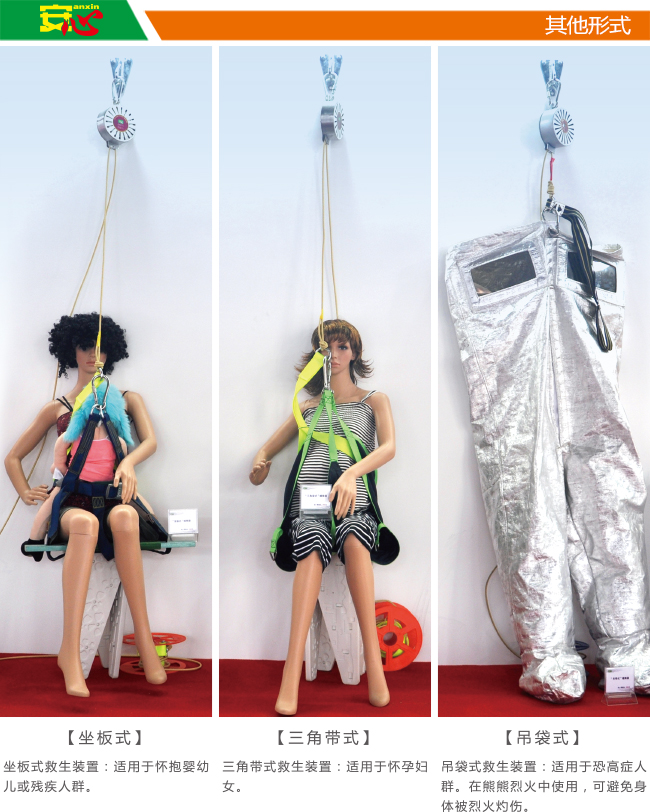 吊袋式逃生緩降器:適用于恐高癥人群。在熊熊烈火中使用,可以有效避免身體被烈火灼傷。