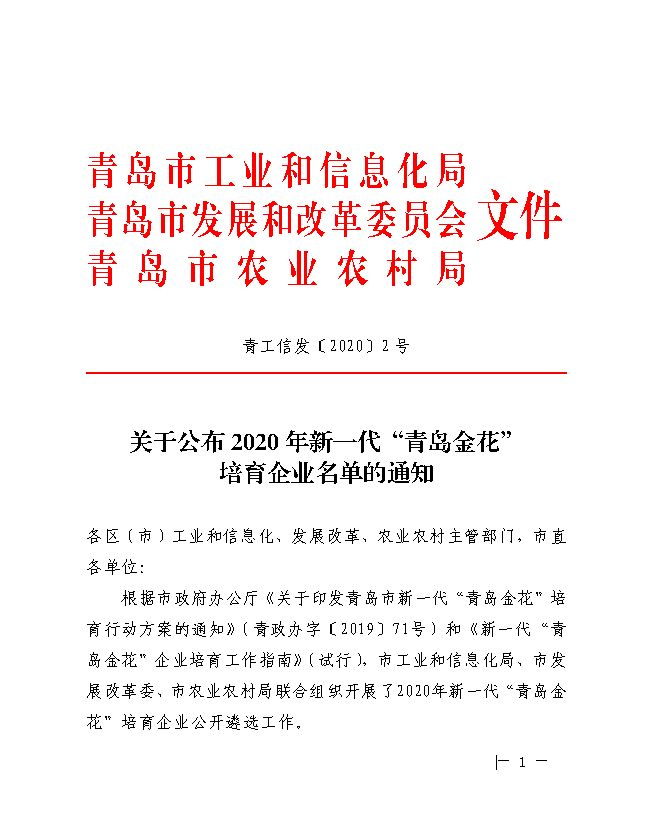 根據(jù)市政府辦公廳《關(guān)于印發(fā)青島市新一代“青島金花”培育行動方案的通知》〔青政辦字〔2019〕71號)和《新一代“青島金花”企業(yè)培育工作指南》〔試行,市工業(yè)和信息化局、市發(fā)展改革委、市農(nóng)業(yè)農(nóng)村局聯(lián)合組織開展了2020年新一代“青島金花”培育企業(yè)公開—選工作。