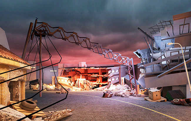 再現(xiàn)地震后,道路變形,有波浪狀也有斷裂上下錯層的場景。在道路兩側(cè)有建筑物倒塌,形成通道。體驗者從破損的通過穿過,到達(dá)一個相對安全的位置。在臨近出口處,設(shè)置一條斷掉的高壓電線掉落在地上,要求體驗者此處應(yīng)該采取單腳跳的方式離開此區(qū)域。
